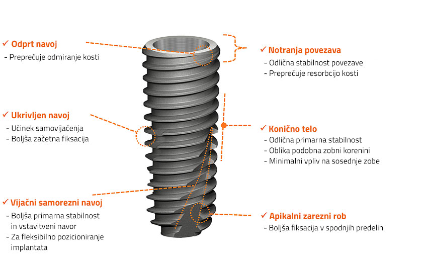 Izjemne oblikovne značilnosti, samorezni navoji in SA metoda obdelave površine so ključne prednosti Osstem implantatov, ki omogočajo boljšo primarno stabilnost in popolno integracijo oz. oseointegracijo.